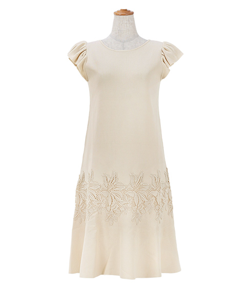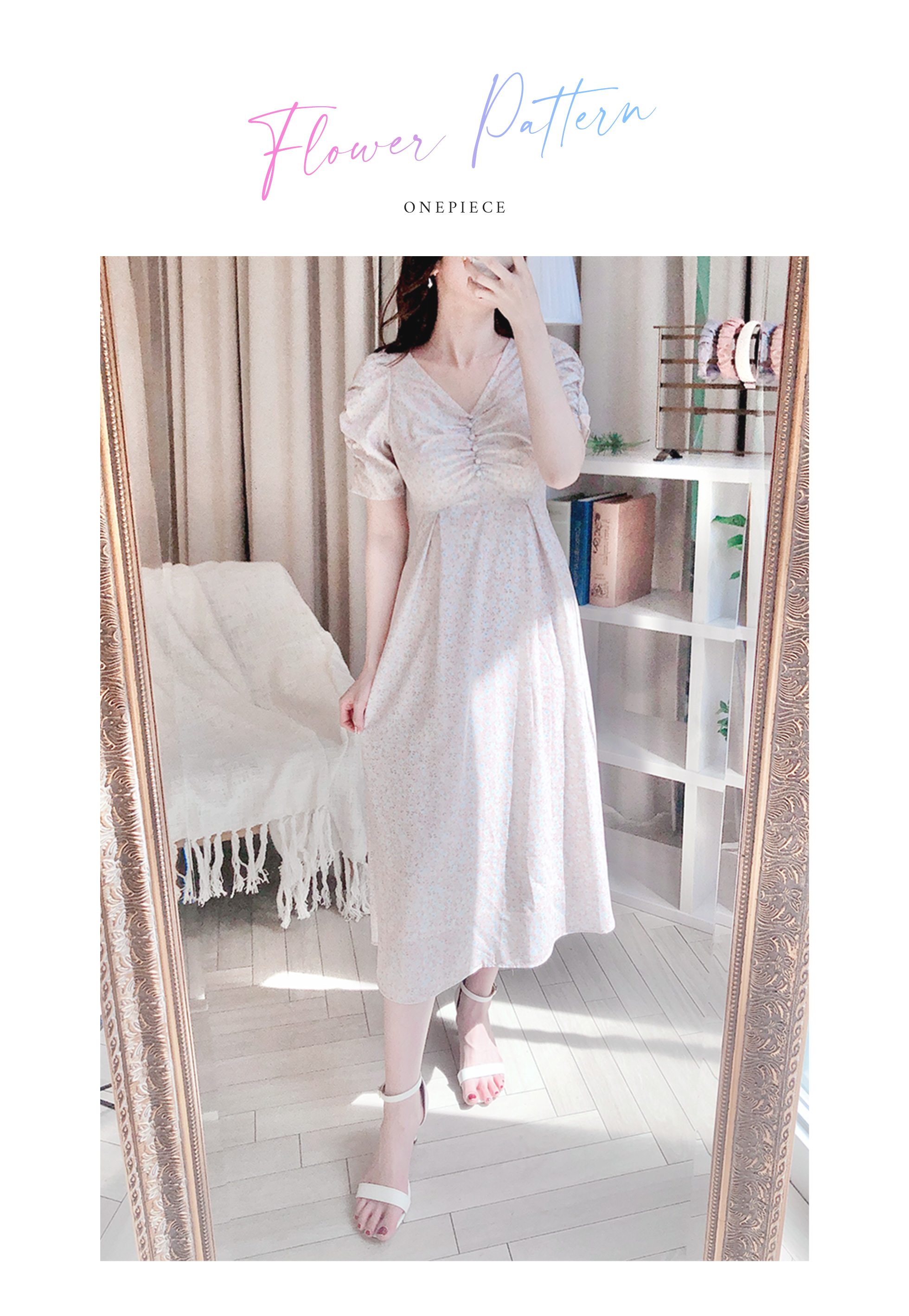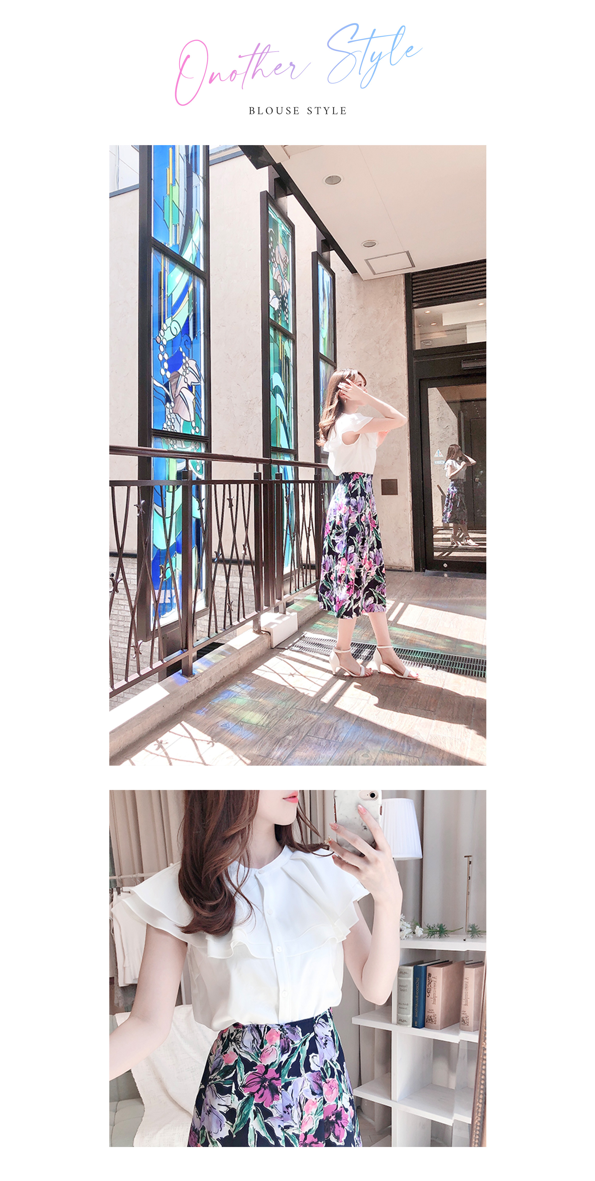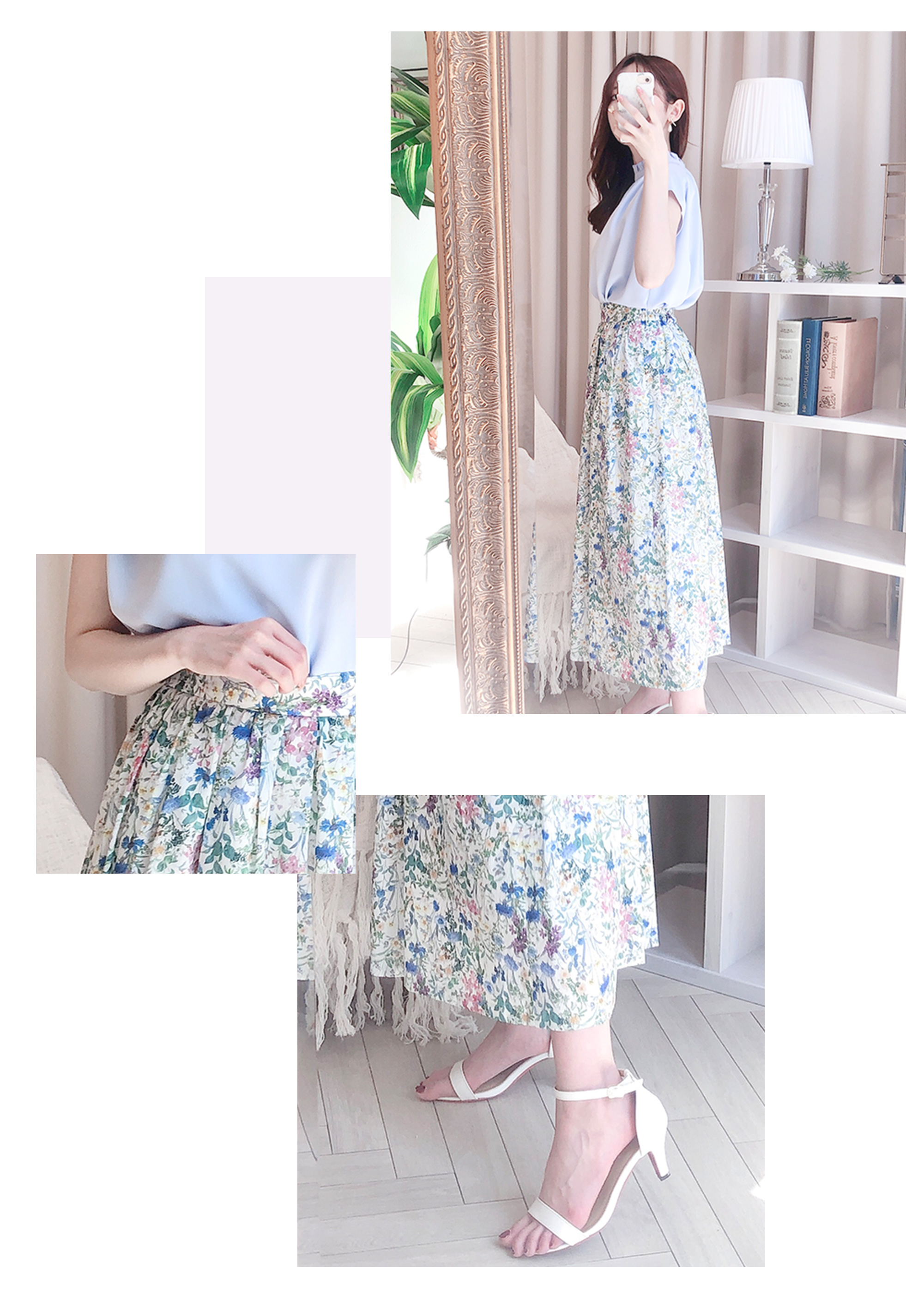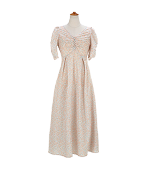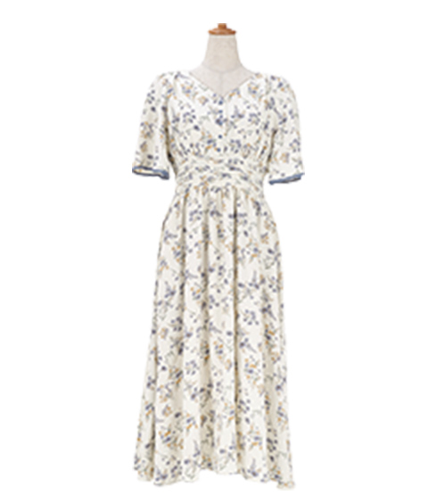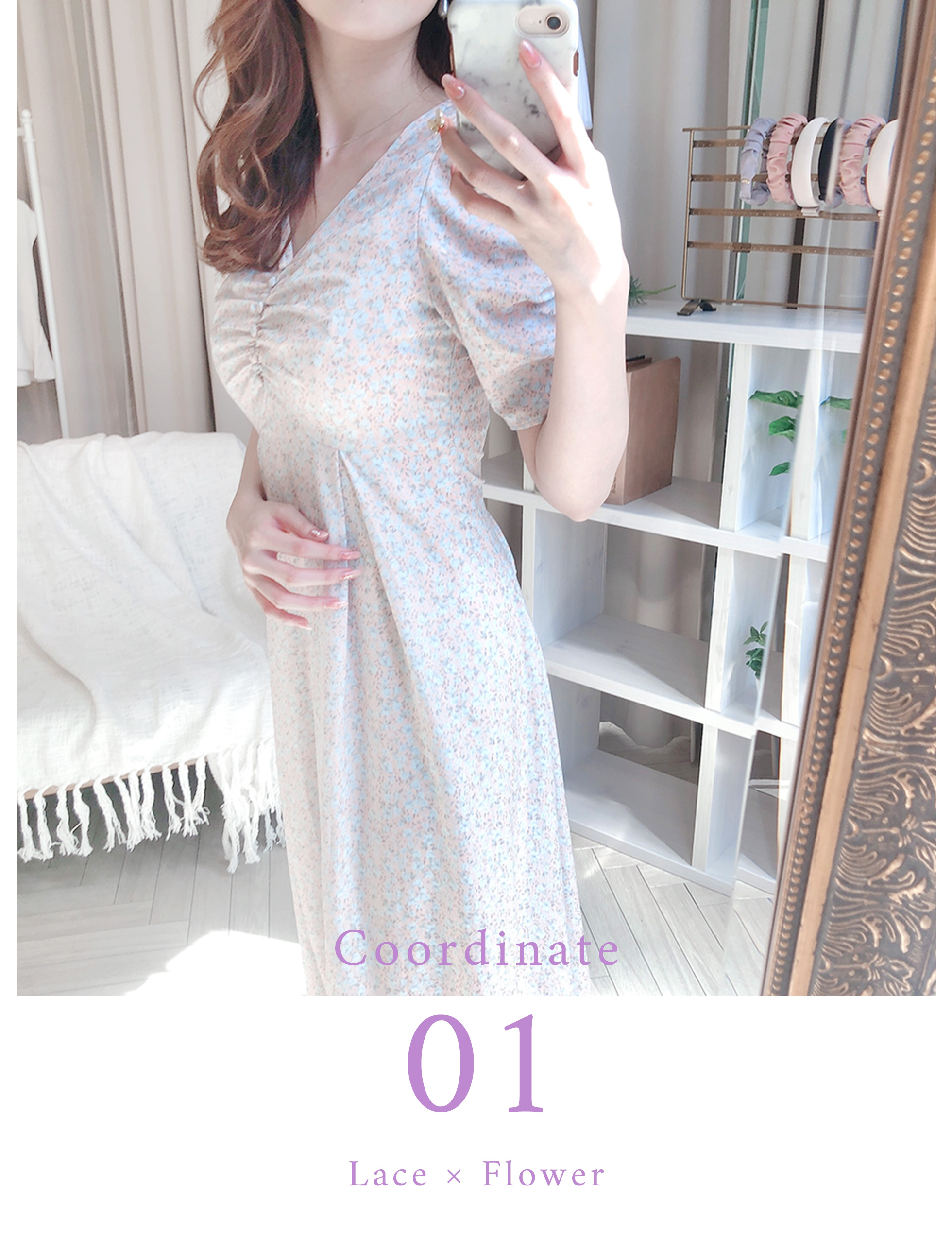 首元のフラワーデザインとスカートの柄がマッチします♡