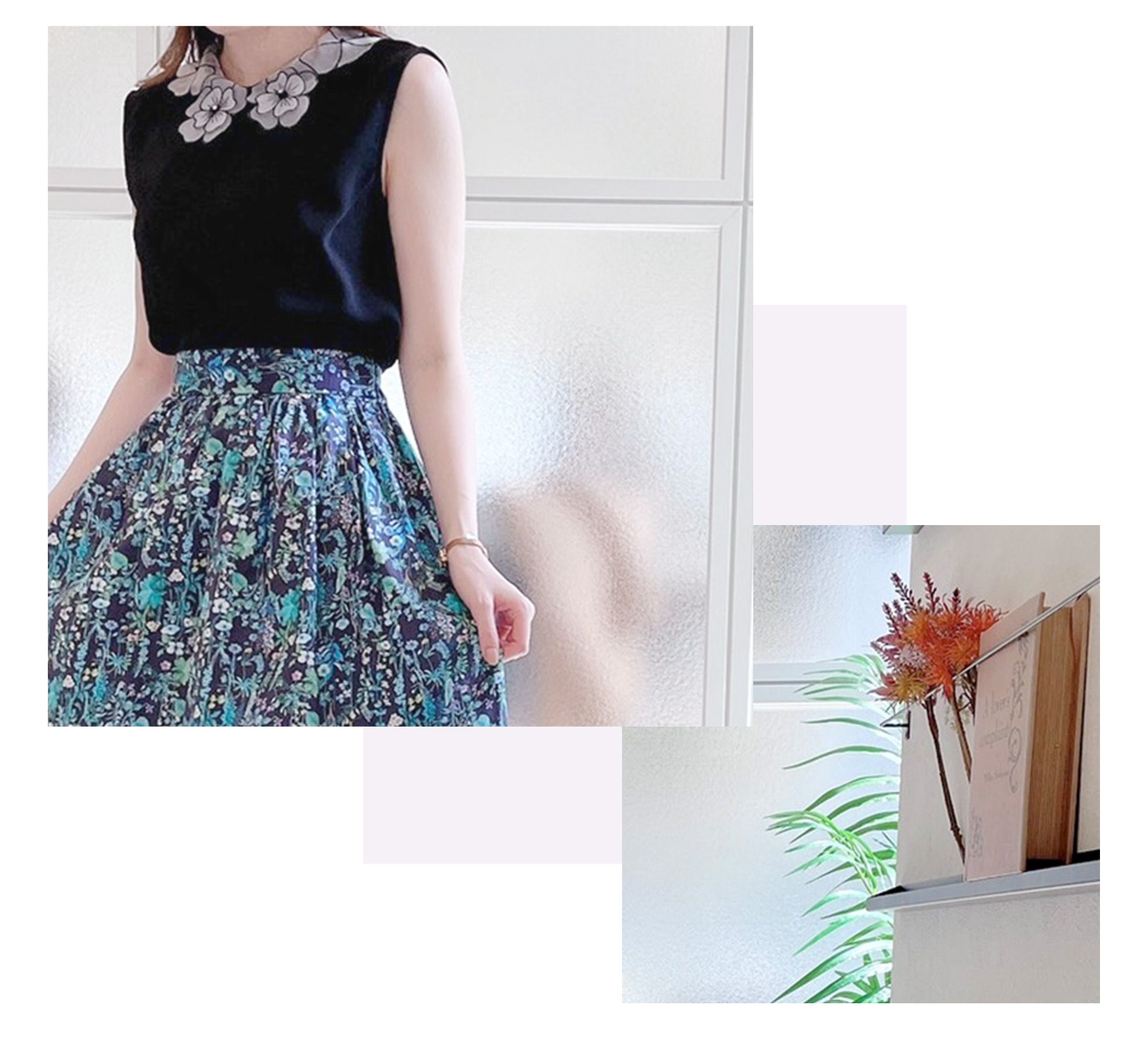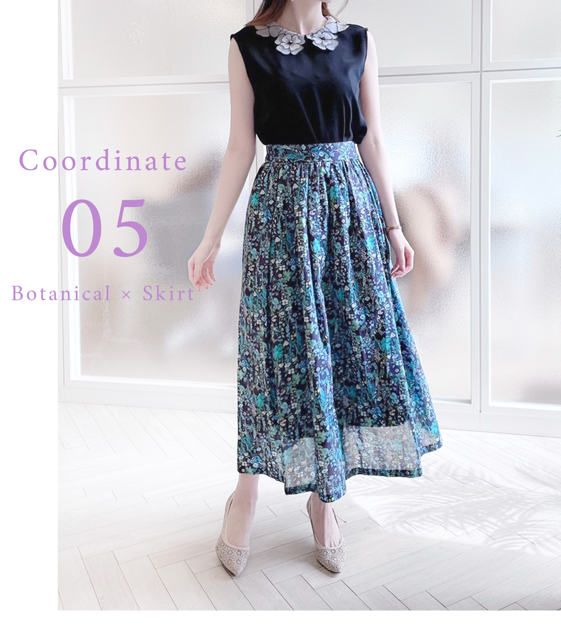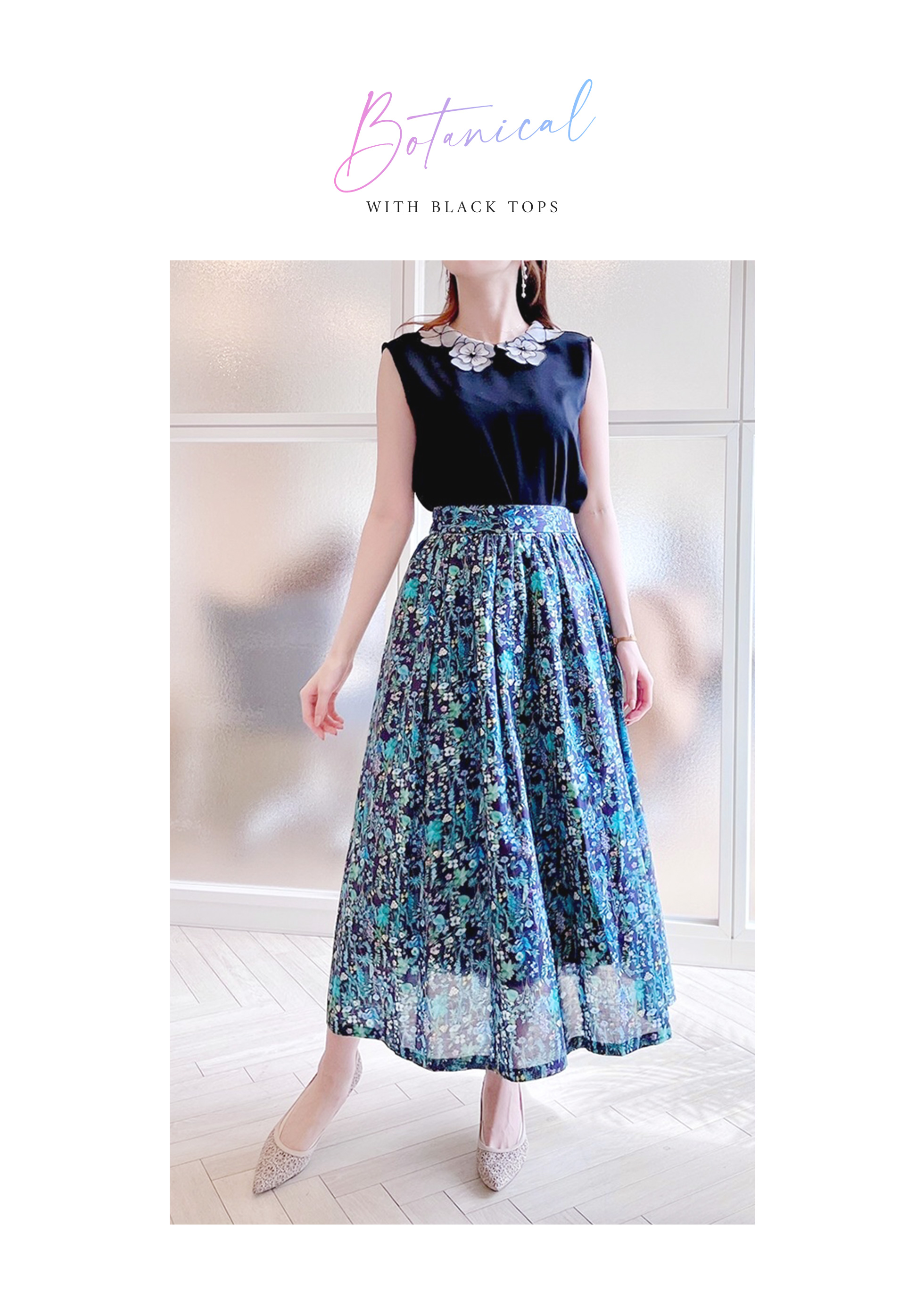 実際に見ると想像以上に大人っぽい印象の花柄で、ブラックのトップスと合わせると甘さ控えめの大人コーデに。