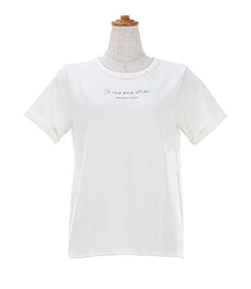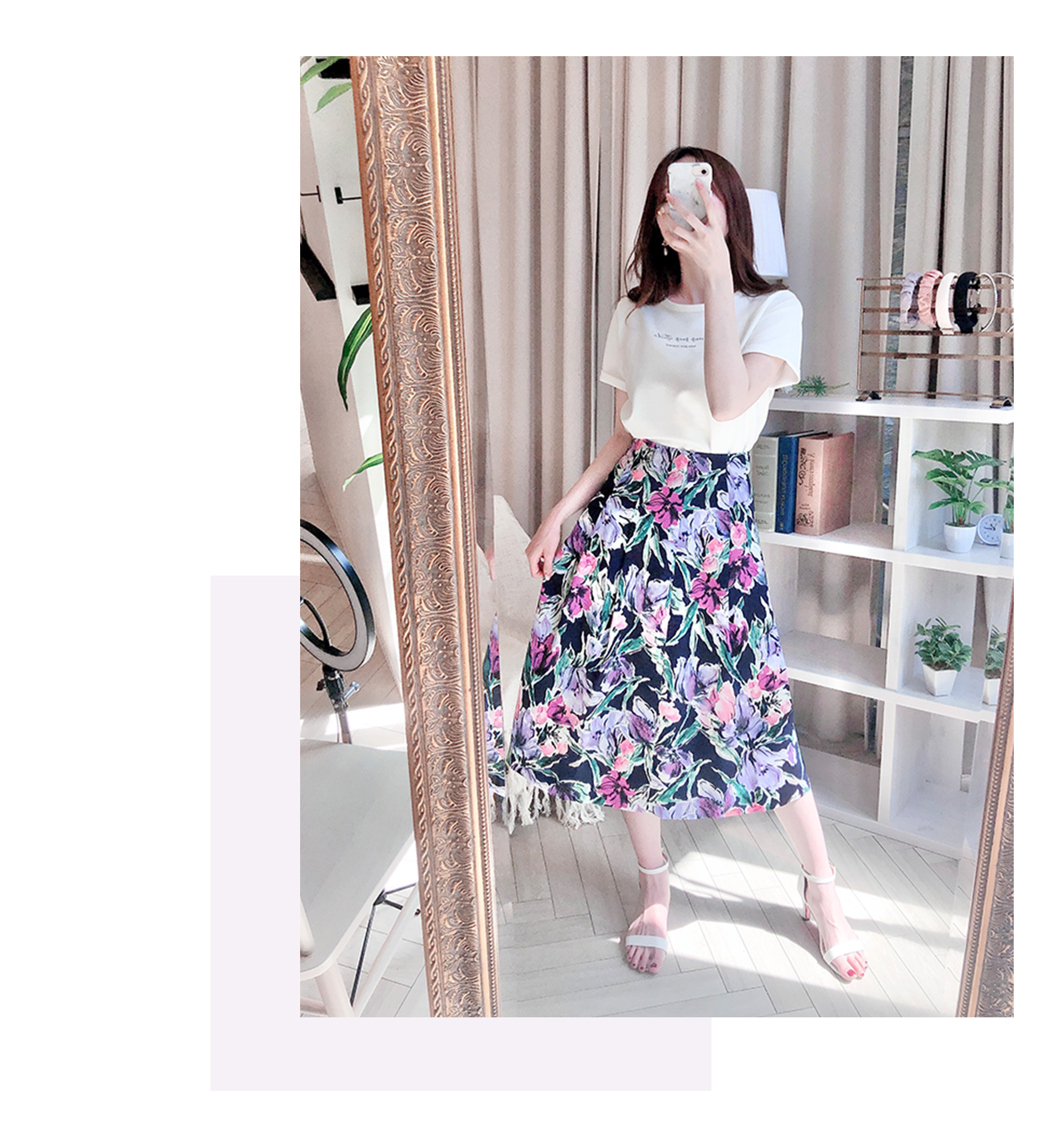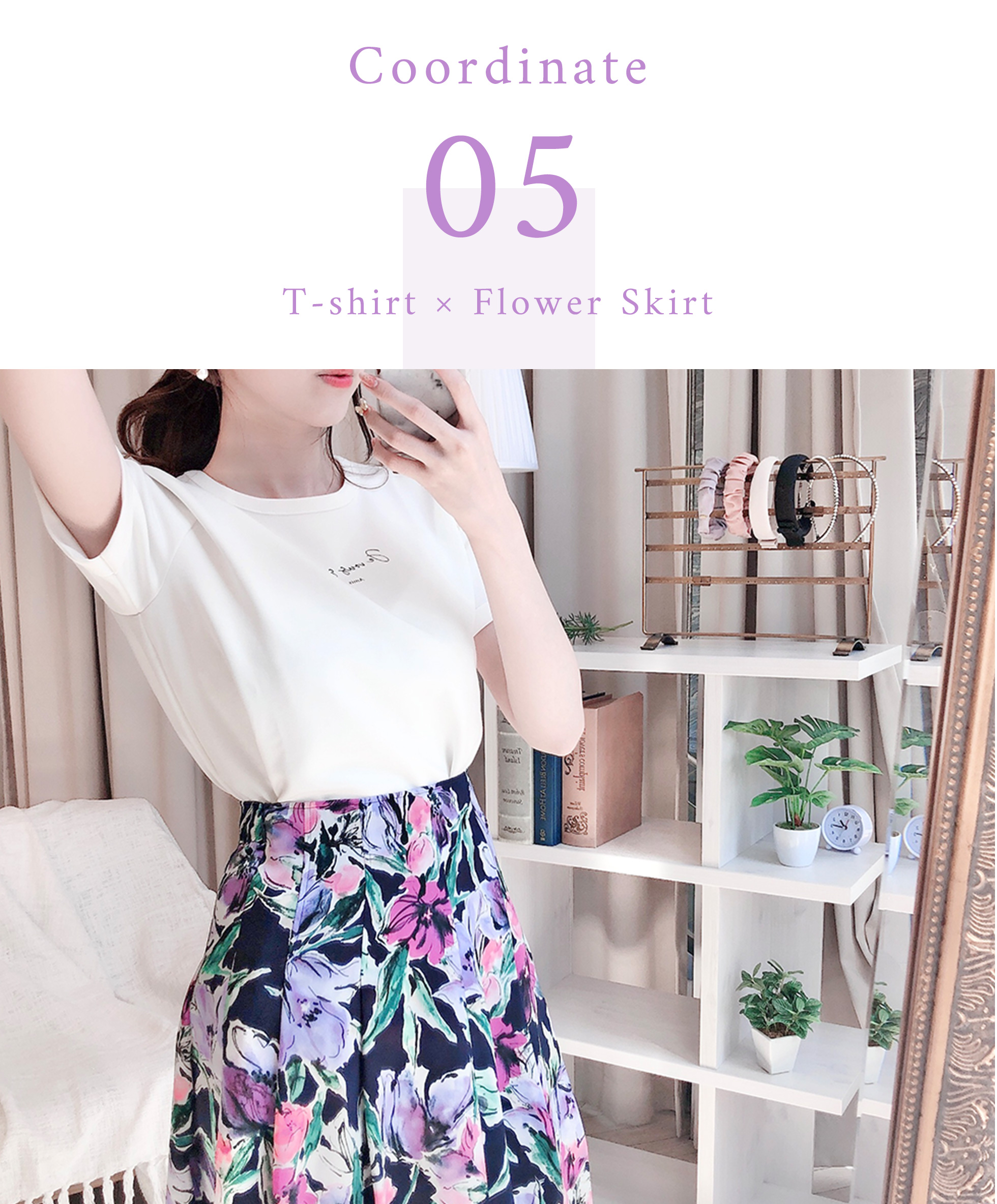 カジュアルに見えがちなTシャツも、大きめの花柄と合わせると大人っぽいスタイリングに!