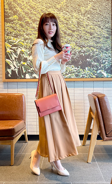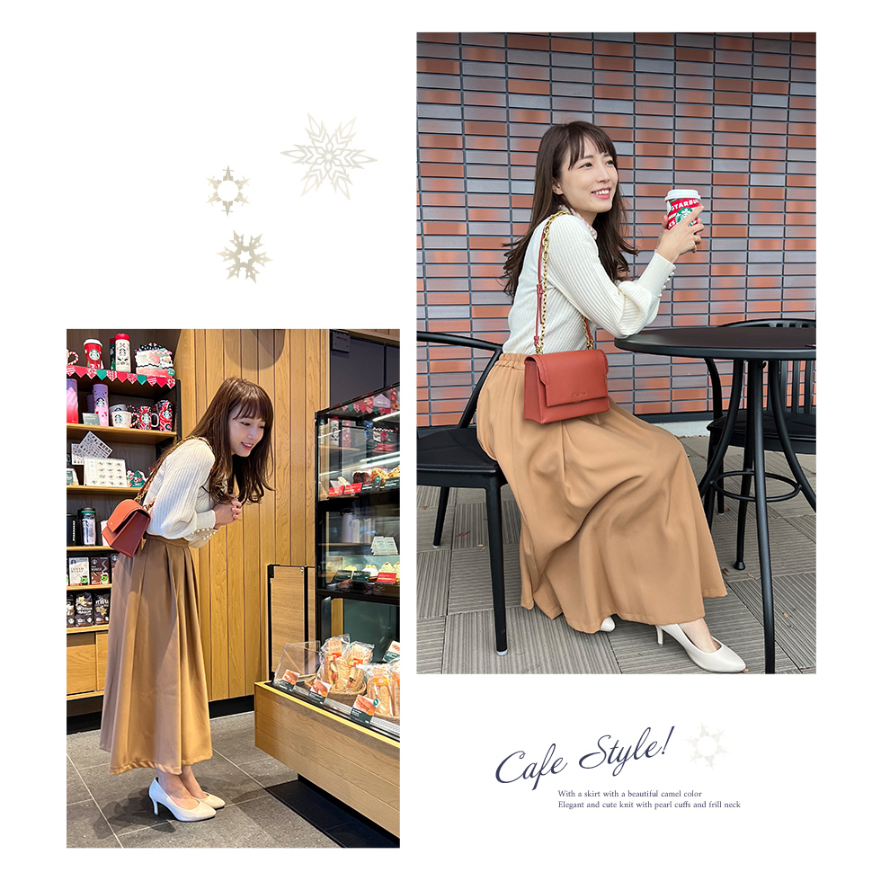キャメルカラーが綺麗なスカートと、袖口パールとフリルネックが上品可愛いニットで、気分はキャラメルマキアート✨