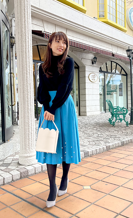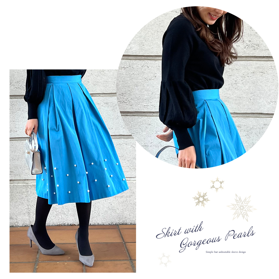主役級に華やかなパール付きスカートには、シンプルだけど負けない袖ぽわんデザインが◎