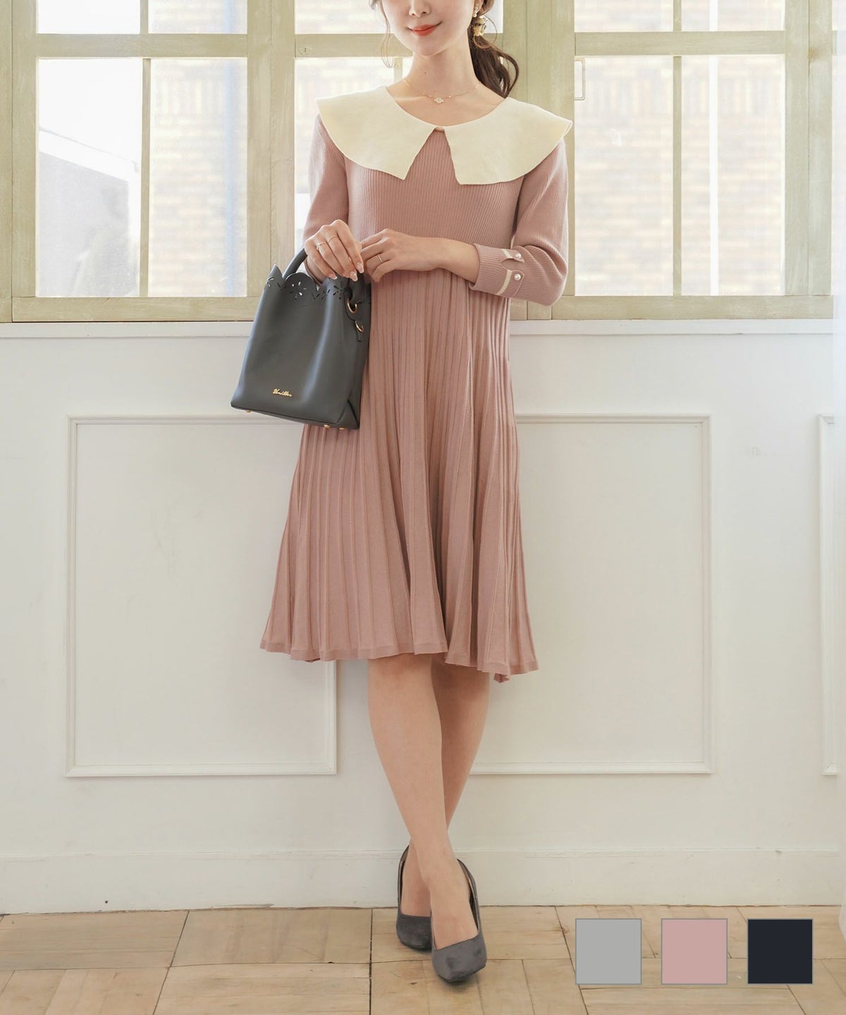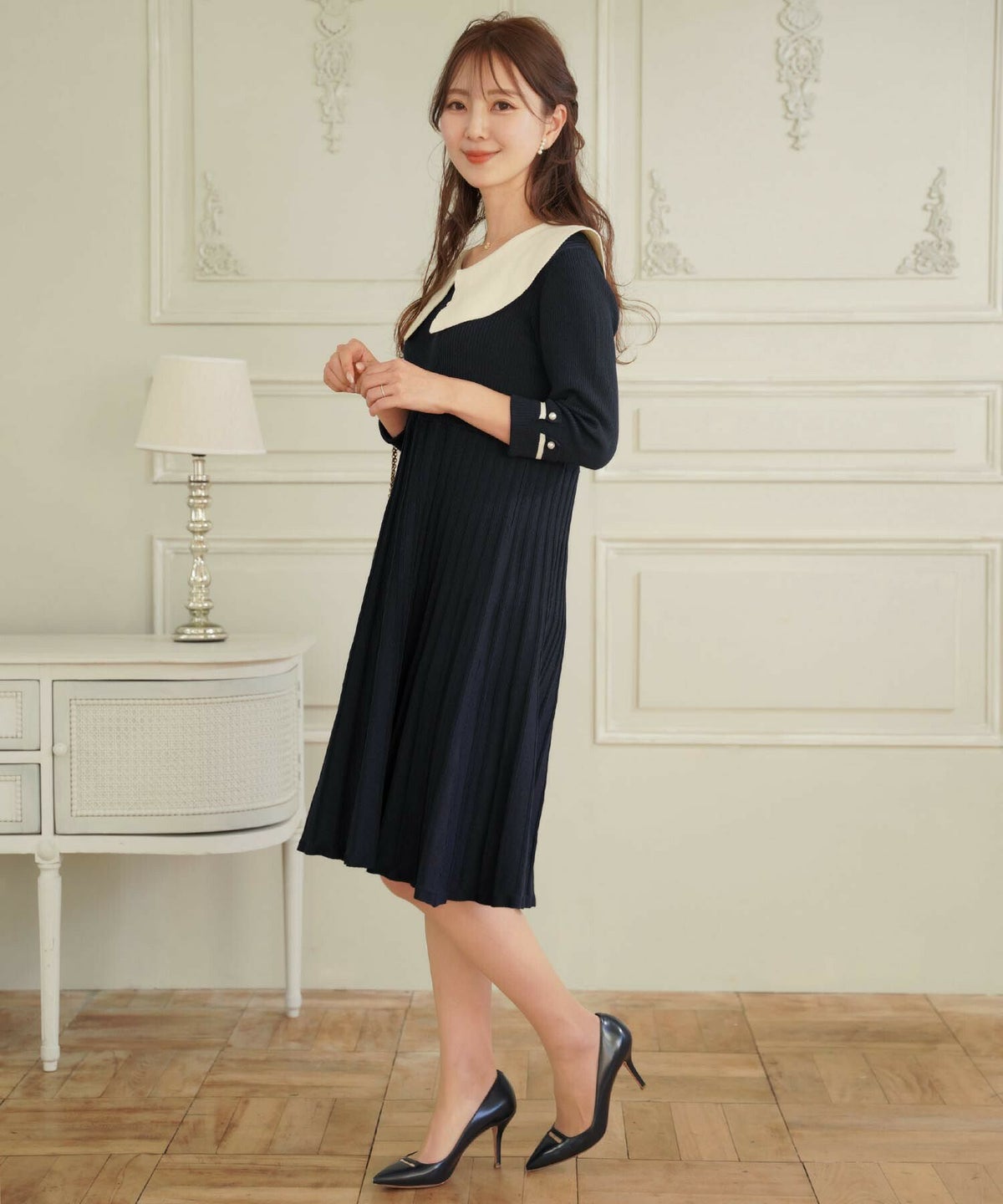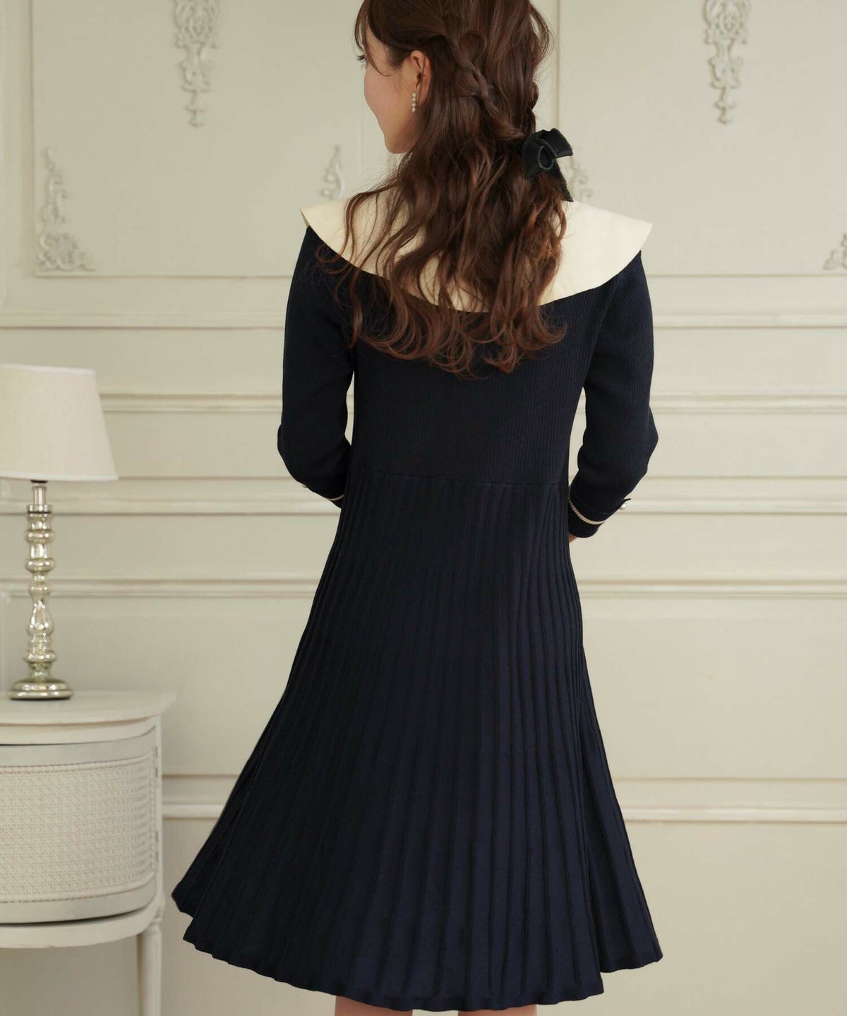 他の画像を見る レディース/ワンピース/プリーツ/膝丈/7分袖衿/配色/パール/フレア バイカラー ニット ワンピース ミディ丈 le reve vaniller 全3色 |lvn321-1641【1】 ¥ 13,090 税込 SOLD OUT for mama お気に入りに登録する